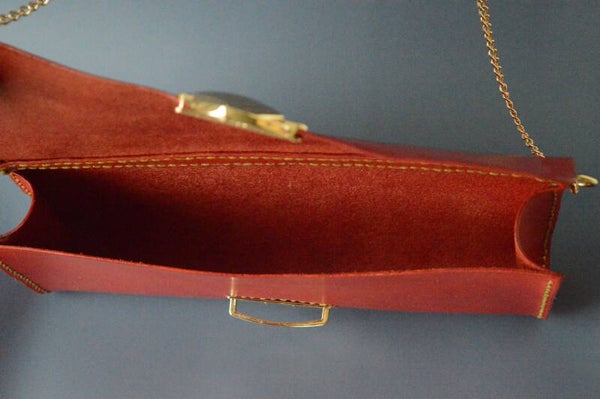Feuerrote Clutch, mit goldenen Beschlägen und mit Goldfaden abgenäht. Randpunzierung.